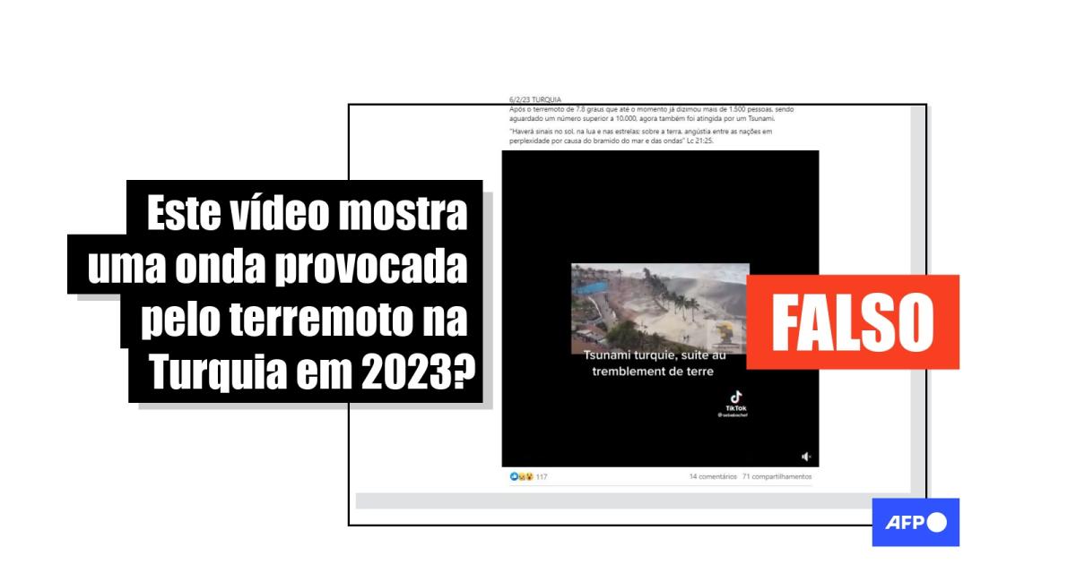 O texto inclui um compilado de vídeos de diferentes ângulos nos quais se vê uma forte onda invadindo a areia e a orla. Entre as sequências encontra-se o vídeo viral que circula vinculado ao terremoto na Turquia em 2023.