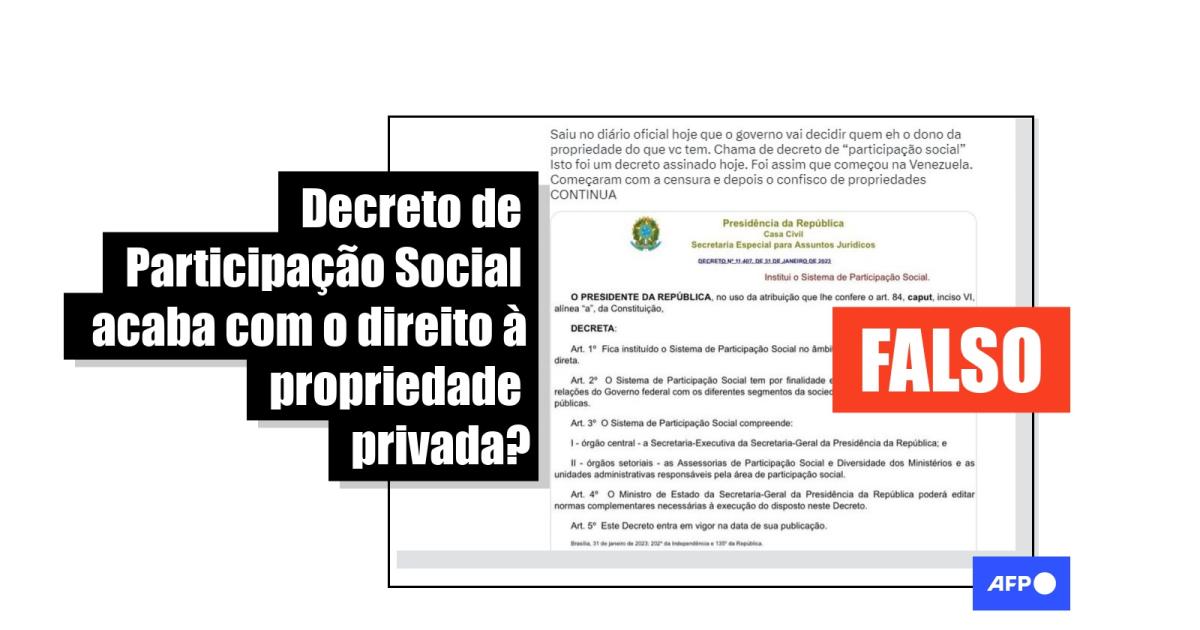 "Saiu no diário oficial hoje que o governo vai decidir quem eh o dono da propiedade do que vc tem. Chama de decreto de ‘participação social’ Isto foi um decreto assinado hoje. Foi assim que começou na Venezuela. Começaram com a censura e depois o confisco de propriedades”, diz uma mensagem que circula no Facebook, Instagram, LinkedIn, Telegram e Twitter.