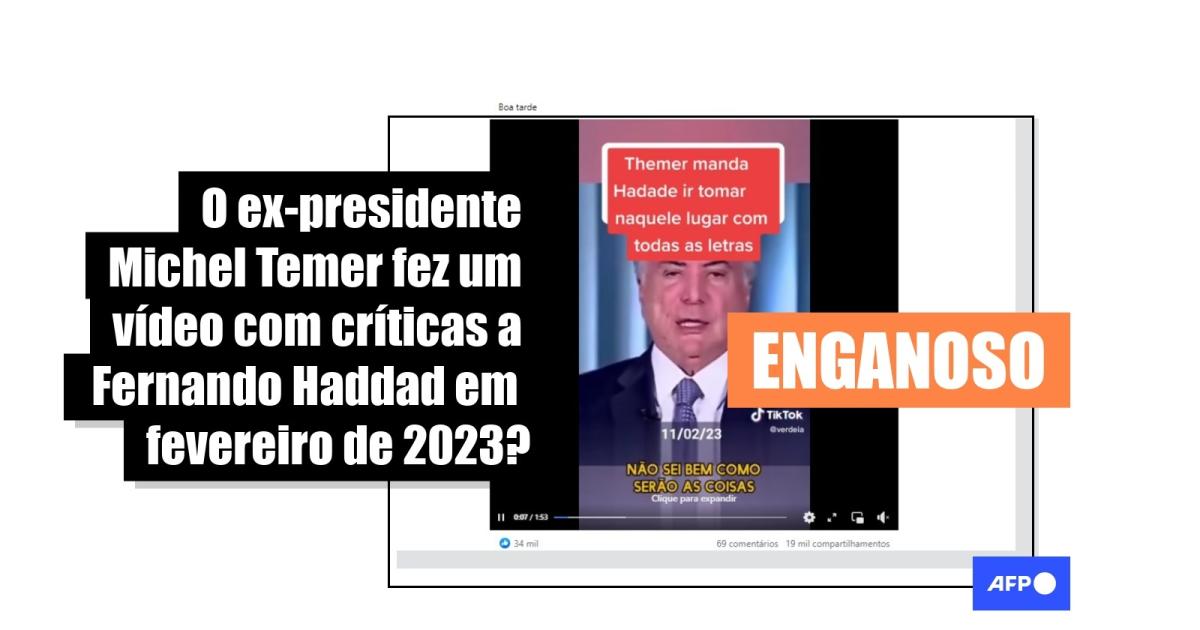 Junto às publicações, usuários compartilham um vídeo no qual Temer afirma que Haddad e aliados “inventam coisas da própria cabeça” ao chamá-lo de “golpista” e defende a reforma trabalhista aprovada durante o seu mandato. Sobreposta ao vídeo vê-se a data “11/02/23”.