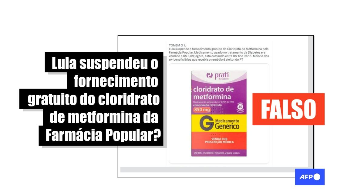“TOMEM O ‘L’. Lula suspende o fornecimento gratuito do Cloridrato de Metformina pela Farmácia Popular. Medicamento usado no tratamento da Diabetes era vendido a R$ 3,69; agora, está custando entre R$ 12 e R$ 16. Maioria dos ex-beneficiários que recebia o remédio é eleitor do PT”, dizem as mensagens, compartilhadas no Twitter, no Facebook e no Instagram.