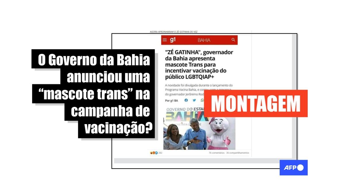 “‘Zé Gatinha’, governador da Bahia apresenta mascote Trans para incentivar vacinação do público LGBTQIAP+”, diz o título de uma matéria que apresenta elementos visuais do portal de notícias g1 e que circula no Facebook, no Instagram, no Kwai, no TikTok e no YouTube.
