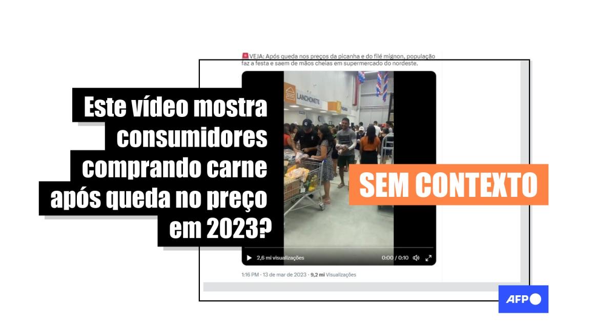 “VEJA: Após queda nos preços da picanha e do filé mignon, população faz a festa e saem de mãos cheias em supermercado do nordeste”, diz uma das publicações compartilhadas no Twitter. O vídeo também circula no Facebook, no Instagram, no TikTok e no Kwai.