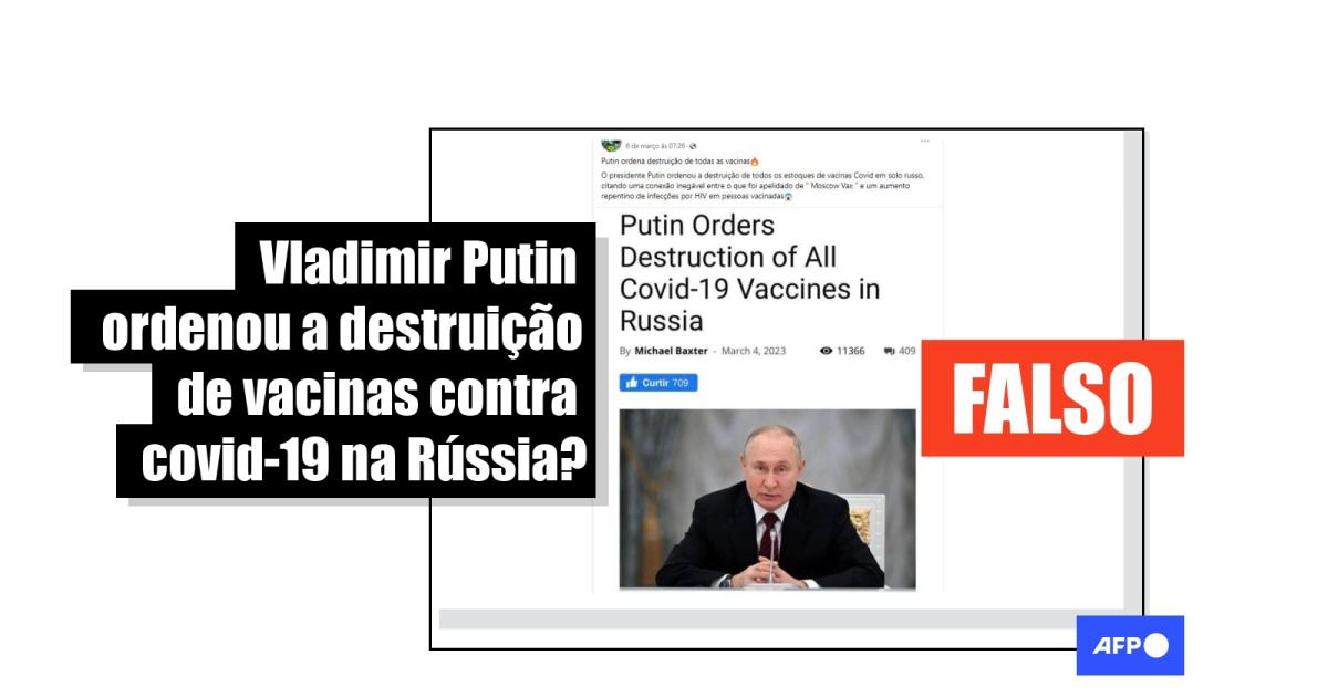 A falsa matéria afirma que Vladimir Putin “ordenou a destruição de todos os estoques de vacinas contra a covid-19 em solo russo, citando uma conexão inegável entre o que foi apelidado de 'Moscow Vax' e um aumento nas infecções por HIV nas pessoas”.