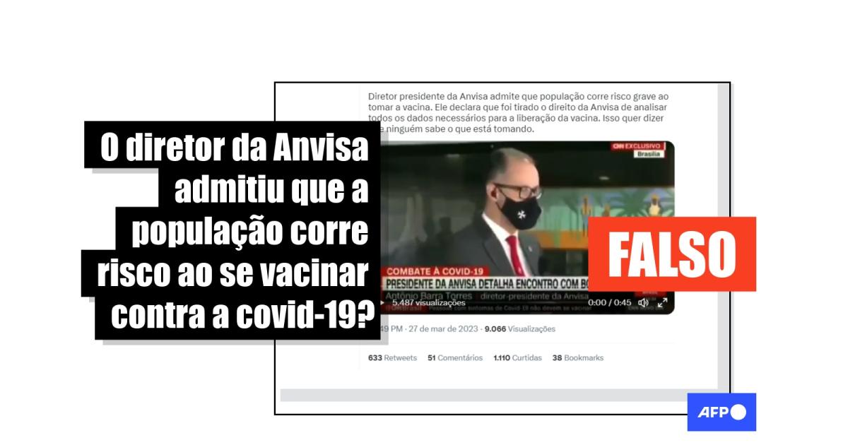 “Diretor presidente da Anvisa admite que população corre risco grave ao tomar a vacina. Ele declara que foi tirado o direito da Anvisa de analisar todos os dados necessários para a liberação da vacina. Isso quer dizer que ninguém sabe o que está tomando”, afirma um usuário que compartilhou o conteúdo no Twitter em março de 2023.