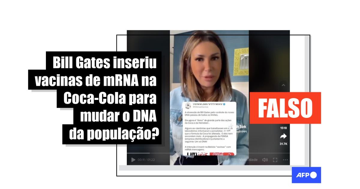 "A obsessão de Bill Gates pelo controle do nosso DNA passou de todos os limites", diz o texto sobreposto a um vídeo, compartilhado no TikTok, no qual uma mulher afirma que o empresário comprou ações da Coca-Cola e da Heineken para alterar a fórmula do refrigerante, inserindo vacinas de mRNA.