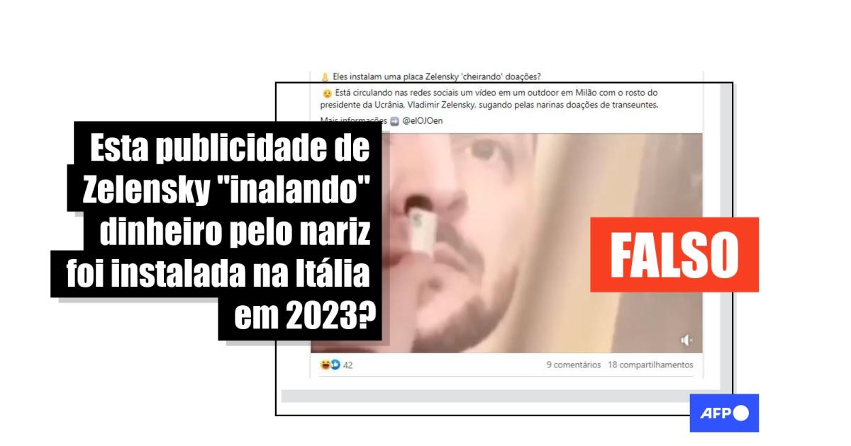 “Está circulando nas redes sociais um vídeo em um outdoor em Milão com o rosto do presidente da Ucrânia, Vladimir Zelensky, sugando pelas narinas doações de transeuntes”, diz uma das publicações compartilhadas no Facebook e no Twitter.