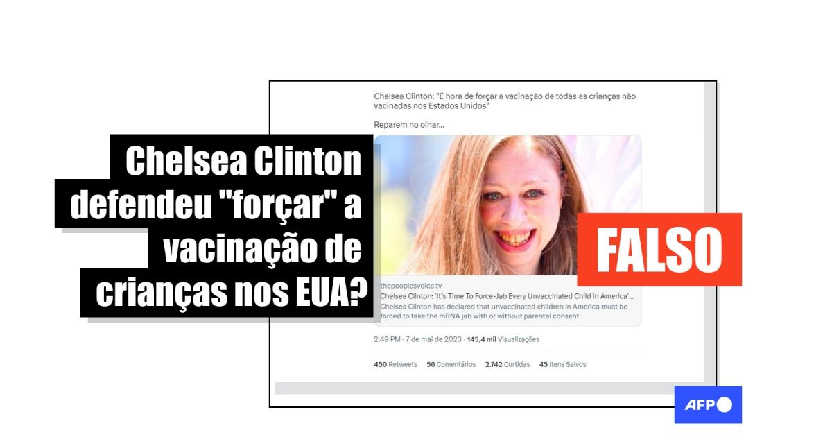 “Os Eugenistas vem com toda a força para o golpe final. Chelsea Clinton declarou que as crianças não vacinadas na América devem ser forçadas a tomar a vacina de mRNA com ou sem o consentimento dos pais”, diz a legenda de uma das publicações compartilhadas centenas de vezes no Facebook, no Instagram, no Kwai, no Twitter e no Telegram desde 7 de maio de 2023.