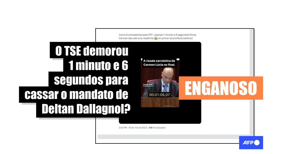 “Tempo que demoraram para cassar o mandato de Deltan”, diz o texto sobreposto a um vídeo compartilhado no Twitter, no TikTok, no Instagram, no Kwai e no Facebook. O conteúdo reproduz um trecho do julgamento, em velocidade acelerada, com um cronômetro contando o tempo até chegar em 1 minuto e 6 segundos.