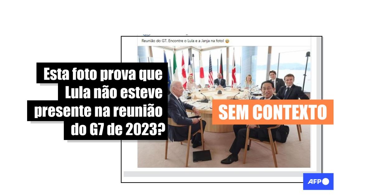 A imagem difundida nas redes foi tirada no dia 19 de maio de 2023 na “reunião 1 (almoço de negócios)” da Cúpula do G7 que tinha como tema a economia global. Mas a ausência de Lula nessa imagem não indica nada de incomum.
