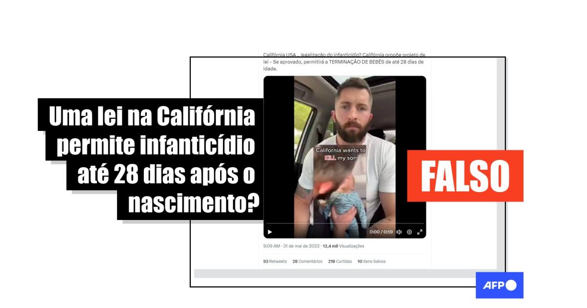 “Califórnia USA .. legalização do infanticídio? Califórnia propõe projeto de lei - Se aprovado, permitirá a TERMINAÇÃO DE BEBÊS de até 28 dias de idade”, diz uma das mensagens compartilhadas no Twitter. O conteúdo circula também no Facebook e no Telegram.