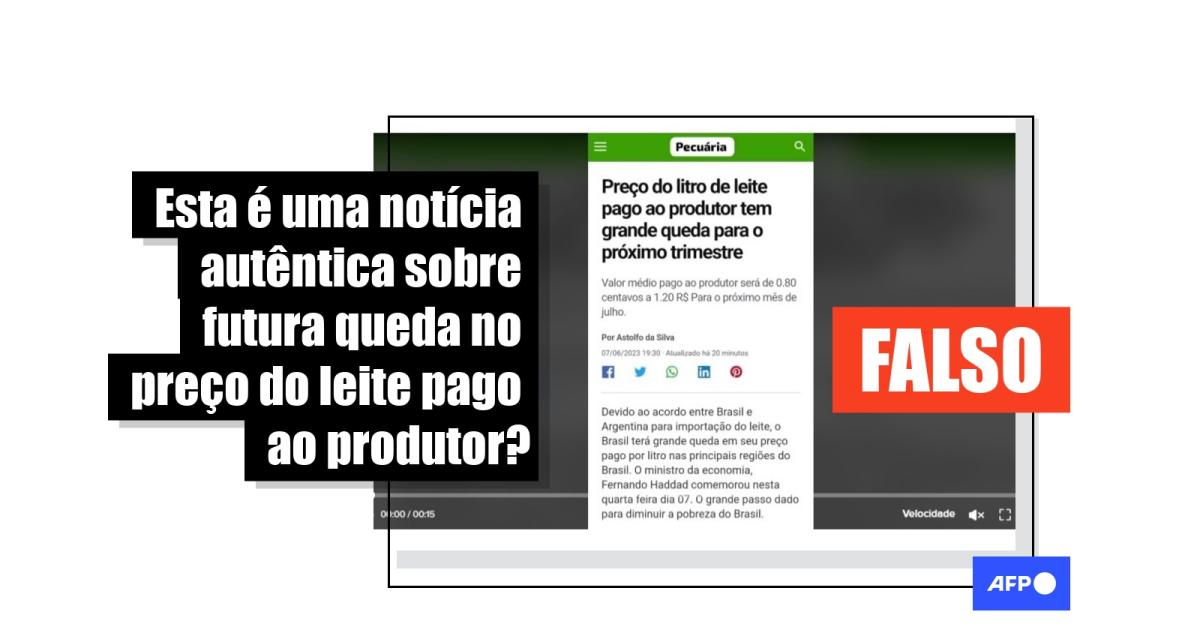 “Devido ao acordo entre Brasil e Argentina para importação do leite, o Brasil terá grande queda em seu preço pago por litro nas principais regiões do Brasil. 0 ministro da economia, Fernando Haddad, comemorou nesta quarta feira dia 07. O grande passo dado para diminuir a pobreza do Brasil”, alega o primeiro parágrafo. O texto seria assinado pelo jornalista “Astolfo da Silva”.