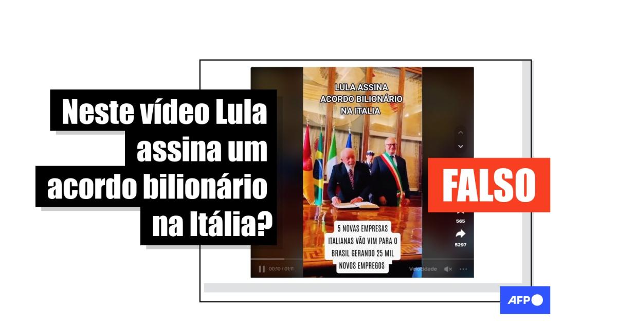 “Lula assina acordo bilionário na Italia. 5 novas empresas italianas vão vim para o Brasil gerando 25 mil novos empregos”, diz a legenda de um vídeo compartilhado no Facebook, no Instagram, no Twitter, no Kwai, no YouTube e no TikTok.