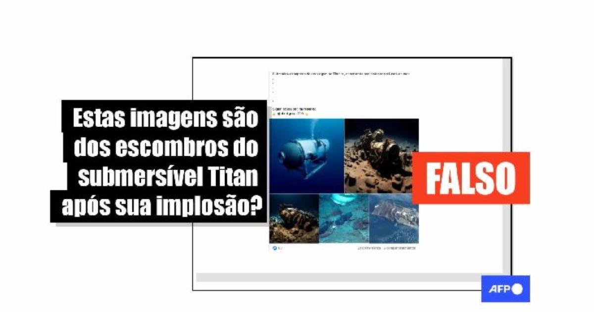 “Submarino desaparecido em viagem ao Titanic, encontrado aos pedaços no fundo do mar”, diz a legenda de uma publicação no Facebook com fotografias atribuídas à embarcação.