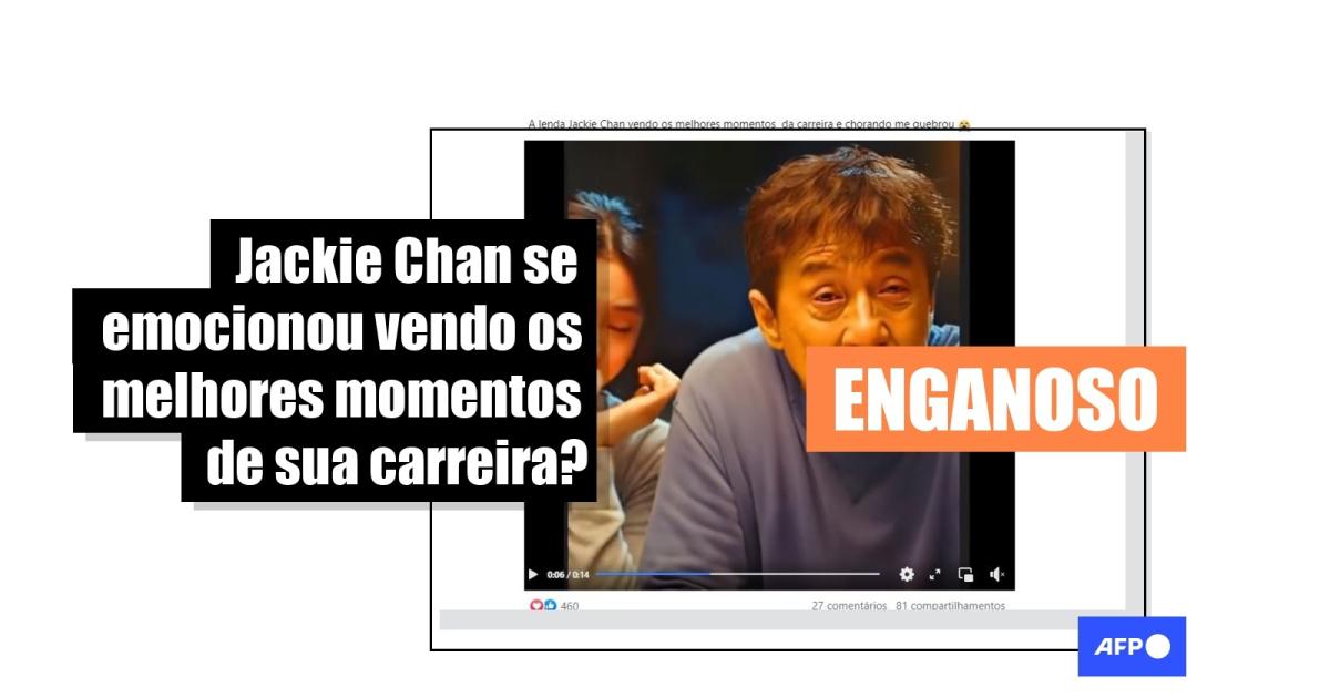 “A lenda Jackie Chan vendo os melhores momentos da carreira e chorando me quebrou”, diz uma das publicações compartilhadas no Facebook, no TikTok, no YouTube e no Twitter.