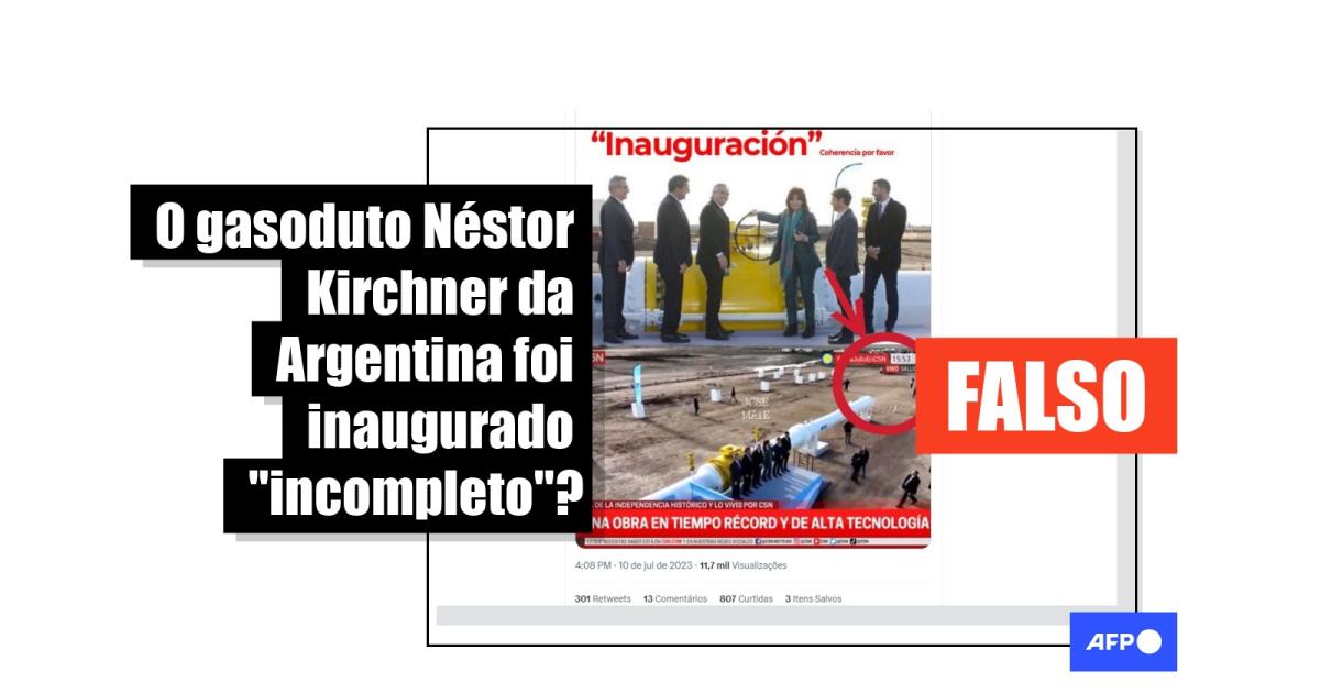 “Aproveitando o feriado da Independência da Argentina neste domingo (9), o kirchnerismo desesperado por votos ‘inaugura’ o gasoduto Presidente Néstor Kirchner que ainda nem terminou de ser construído. É assim que a esquerda atua”, diz uma das publicações que foram compartilhadas no Facebook, no Instagram e no Twitter, que incluem uma imagem do ato de inauguração do gasoduto Néstor Kirchner em que a tubulação parece interrompida. A mensagem utiliza uma captura de tela de uma passagem da transmissão oficial do evento.