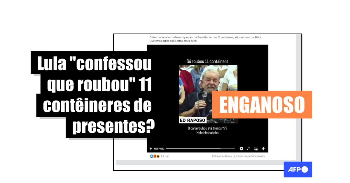“O descondenado confessou que saiu da Presidência com 11 containers”, diz um dos conteúdos compartilhados no Facebook, que usa um trecho de uma entrevista de Lula com a frase “Só roubou 11 containers” sobreposta às imagens.