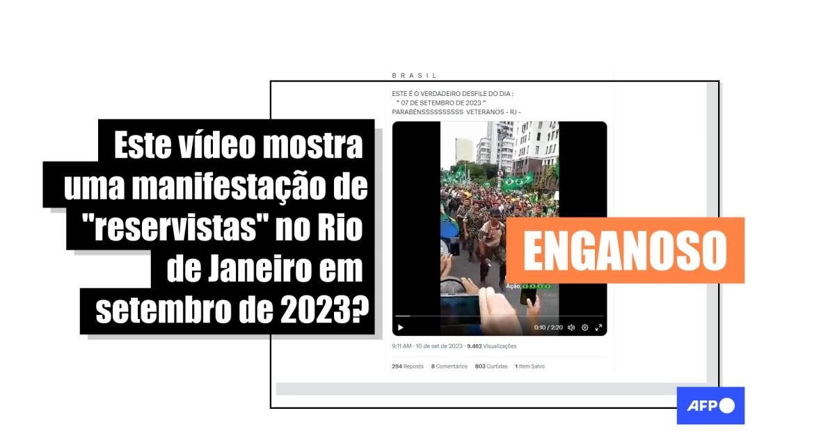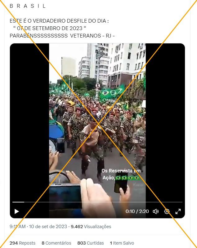 “B R A S I L ESTE É O VERDADEIRO DESFILE DO DIA : “ 07 DE SETEMBRO DE 2023 “ PARABÉNSSSSSSSSSS VETERANOS - RJ -”, afirma um dos usuários em publicações compartilhadas com o vídeo no X (antes Twitter) e no YouTube. Alegações similares, de que a manifestação ocorreu em outros dias de setembro, também circulam no Facebook (1, 2) e no TikTok (1, 2).