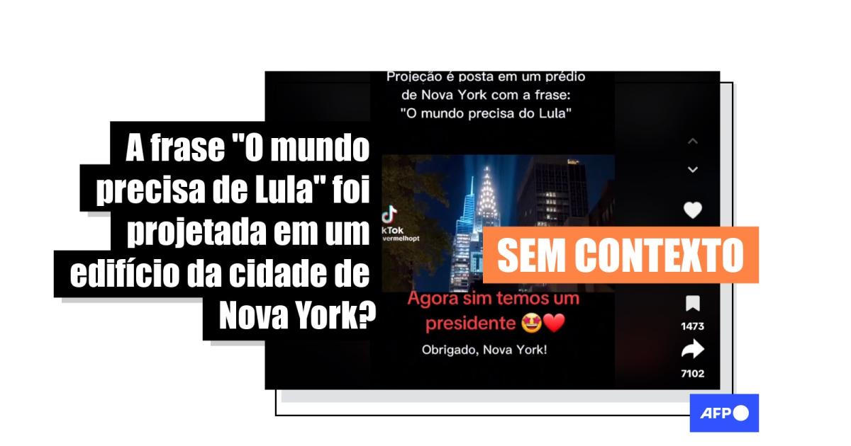 “Projeção é posta em um prédio de Nova York com a frase: ‘O mundo precisa de Lula’. Agora sim temos um presidente”, lê-se em um dos vídeos compartilhados no TikTok. O conteúdo circula também no Facebook, no Instagram, no Kwai e no X (antes Twitter).