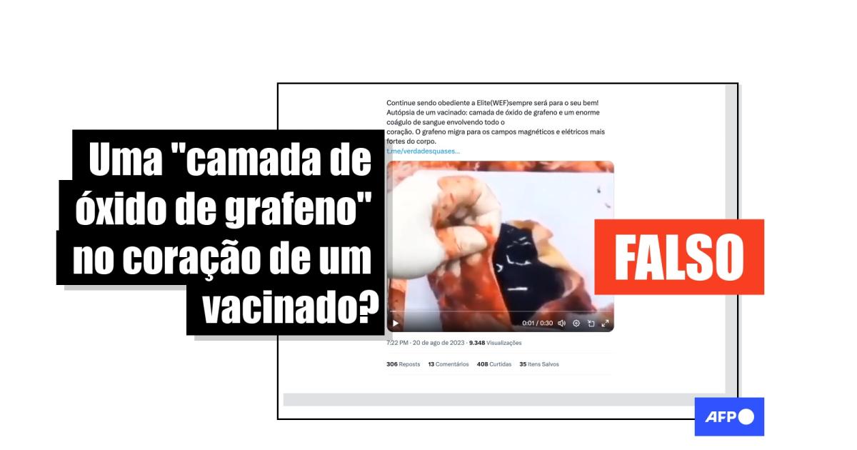 "Autópsia de um inoculado com as picadas mortais chamadas de vacinas. Uma camada de óxido de grafeno e um enorme coágulo de sangue envolvem todo o coração. O óxido de grafeno migra para os campos magnéticos e elétricos mais fortes do corpo”, dizem publicações no Facebook, no Instagram, no Telegram e no X (antes Twitter).