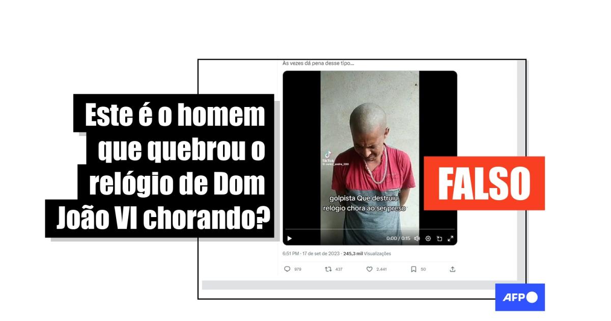 No vídeo viral, um homem, usando uma camisa com cores vermelhas, é visto de cabeça abaixada e aparentemente chora enquanto uma narração ao fundo diz: “E o golpista que destruiu o relógio histórico que estava em exposição no Palácio do Planalto permaneceu em silêncio durante o depoimento à polícia. Ele pode responder por até seis crimes. Antônio Cláudio Alves Ferreira aparece nessas imagens destruindo”.