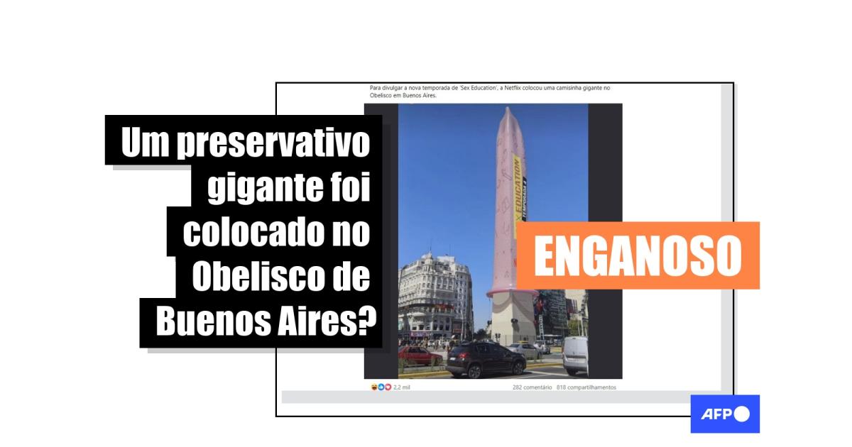 “Para divulgar a nova temporada de ‘Sex Education’, a Netflix colocou uma camisinha gigante no Obelisco em Buenos Aires”, diz a legenda de uma publicação no Facebook.