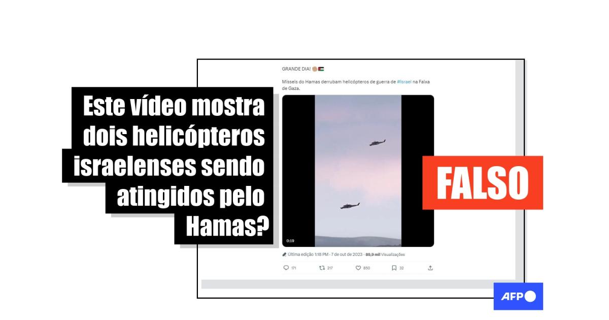 “Mísseis do Hamas atingem helicópteros israelenses”, diz a legenda de um vídeo no Instagram. A sequência também circula no X (antes Twitter), no Facebook e no TikTok.