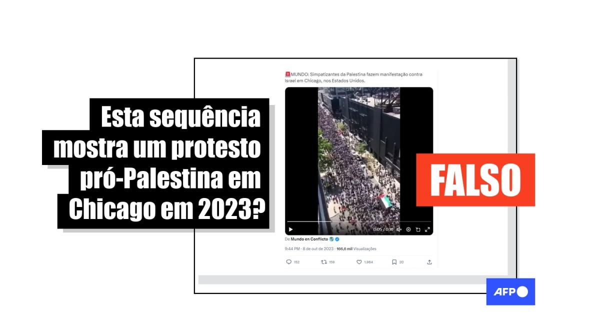 “Simpatizantes da Palestina fazem manifestação contra Israel em Chicago, nos Estados Unidos”, diz a legenda de publicações no X (antes Twitter), no Facebook e no Kwai.