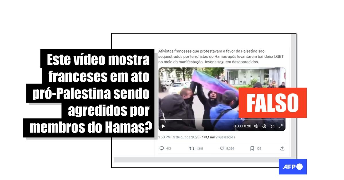 “Ativistas franceses que protestavam a favor da Palestina são sequestrados por terroristas do Hamas após levantarem bandeira LGBT no meio da manifestação. Jovens seguem desaparecidos”, diz o texto com o vídeo ou capturas de tela da sequência em publicações que circulam no X (antes Twitter), no Instagram, no Facebook e no TikTok.