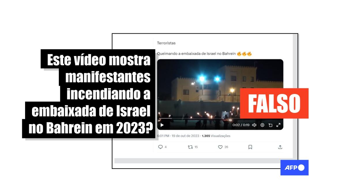 “Terroristas queimando a embaixada de Israel no Bahrein”, diz um dos conteúdos compartilhados no X (antes Twitter). A gravação circula também no Facebook, no Instagram, no Kwai e no TikTok. Uma versão arquivada do site Brasil 247 mostra que o veículo também publicou a filmagem em 19 de outubro de 2023.