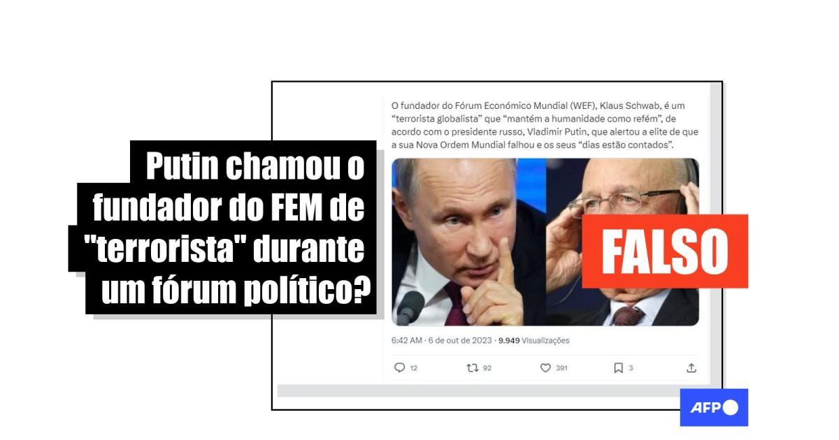 “O fundador do Fórum Econômico Mundial (WEF), Klaus Schwab, é um ‘terrorista globalista’ que ‘mantém a humanidade como refém’, de acordo com o presidente russo, Vladimir Putin, que alertou a elite de que a sua Nova Ordem Mundial falhou e os seus ‘dias estão contados’”, dizem publicações que circulam no Facebook e no X (antes Twitter).