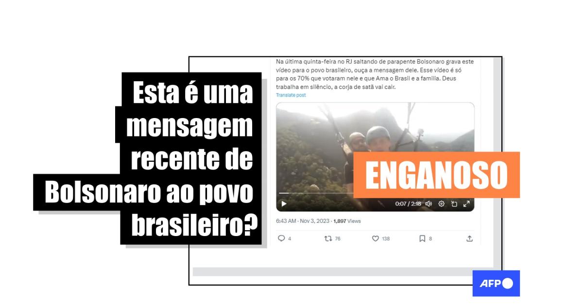 “Na última quinta-feira no RJ saltando de parapente Bolsonaro grava este vídeo para o povo brasileiro, ouça a mensagem dele. Esse vídeo é só para os 70% que votaram nele e que Ama o Brasil e a familia”, diz uma das publicações que circulam no X (antes Twitter), no Facebook, no TikTok, no Kwai e no Instagram.