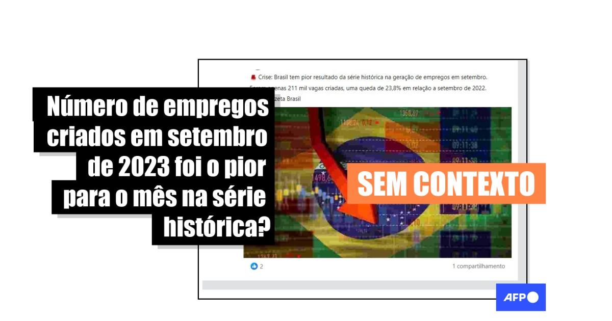“Crise: Brasil tem pior resultado da série histórica na geração de empregos em setembro. Foram apenas 211 mil vagas criadas, uma queda de 23,8% em relação a setembro de 2022. Fonte: Gazeta Brasil”, diz a mensagem que circula no Facebook. O conteúdo circula também no X.