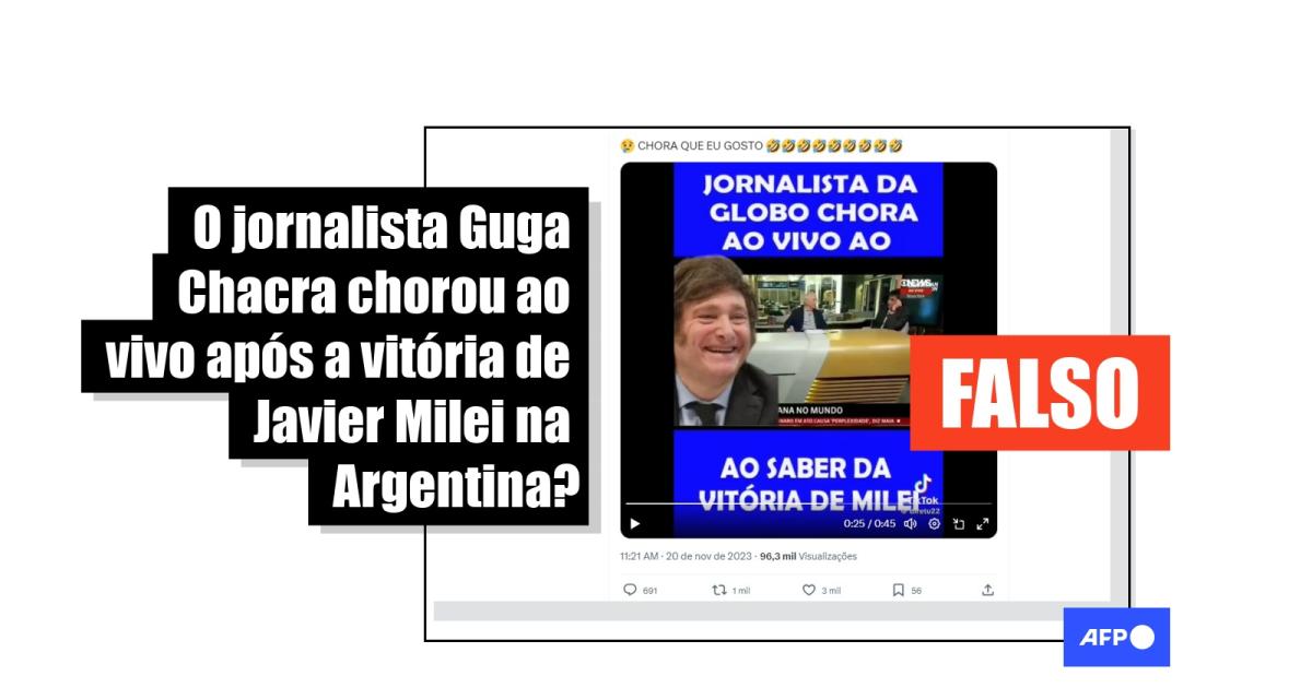 As mensagens compartilham duas sequências de programas do canal de notícias GloboNews. Na primeira, o apresentador Erick Bang anuncia que os resultados parciais da apuração da votação argentina já permitiam indicar a vitória de Javier Milei. Na segunda passagem, o comentarista Guga Chacra aparece afirmando ser “muito triste tudo isso” e fazendo uma pausa em que parece chorar.