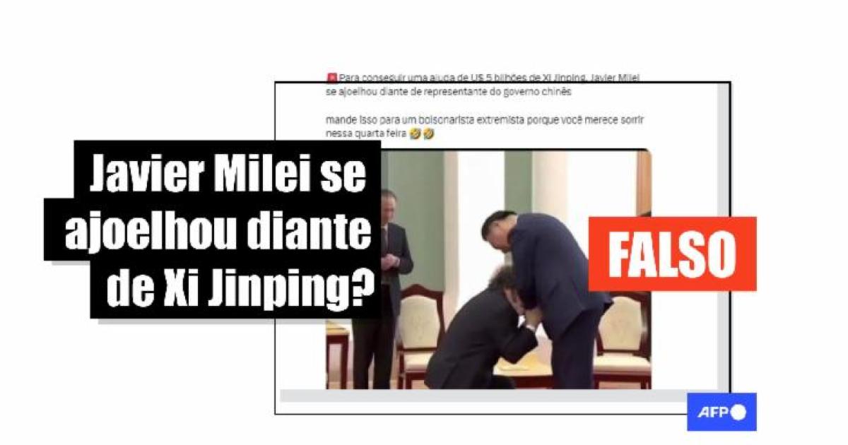 “Para conseguir uma ajuda de U$ 5 bilhões de Xi Jinping, Javier Milei se ajoelhou diante de representante do governo chinês”, diz a legenda que compartilha a suposta fotografia no X (antes Twitter). A mesma imagem foi publicada em outras redes sociais, como no Instagram, no Facebook e no TikTok.