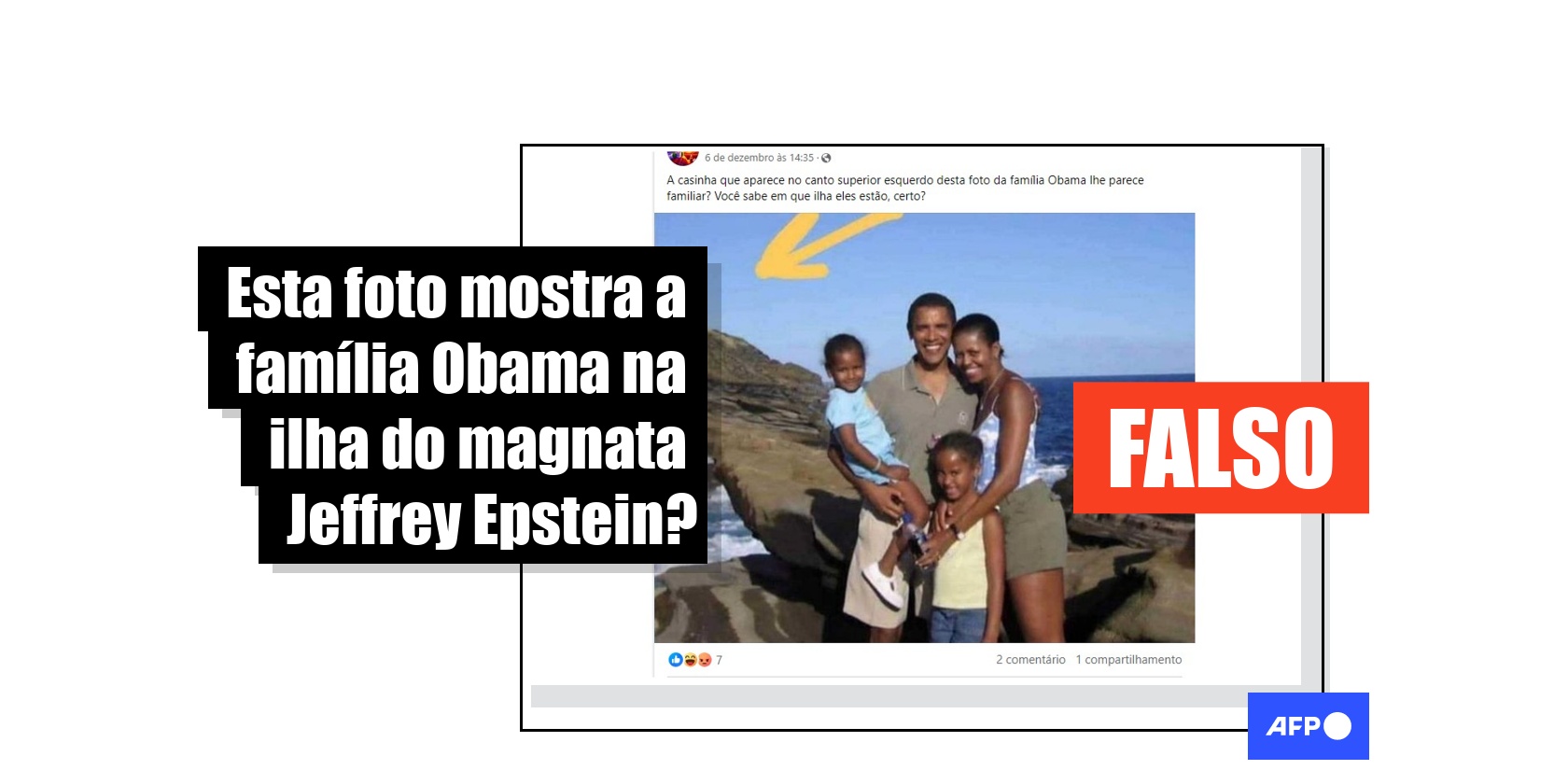 Uma foto da família do ex-presidente dos Estados Unidos Barack Obama não foi tirada na ilha do falecido magnata acusado de exploração sexual Jeffrey Epstein, ao contrário do que afirmam publicações que somam centenas de interações nas redes sociais. A informação falsa, que circula desde agosto de 2020, voltou a ser compartilhada em dezembro de 2023, mas a imagem foi manipulada para incluir ao fundo uma construção relacionada ao financista. O registro original mostra a família em Oahu, no Havaí.