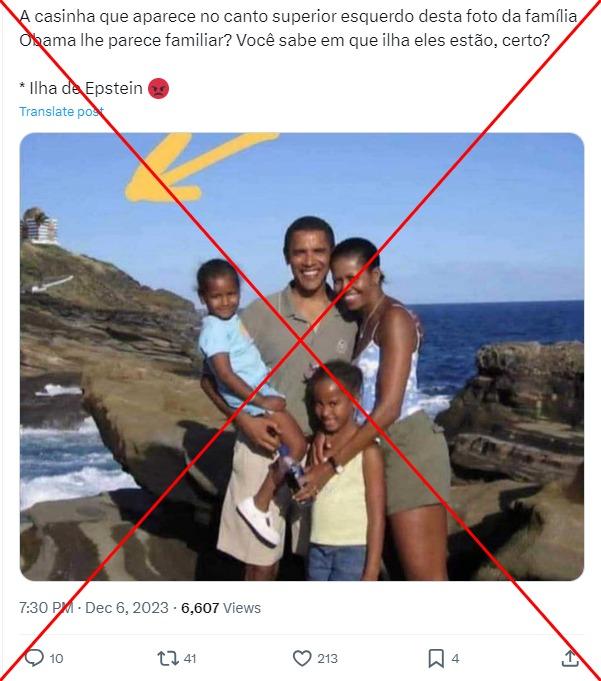 “A casinha que aparece no canto superior esquerdo desta foto da família Obama lhe parece familiar? Você sabe em que ilha eles estão, certo? Ilha de Epstein”, diz uma das publicações compartilhadas no Facebook e no X.