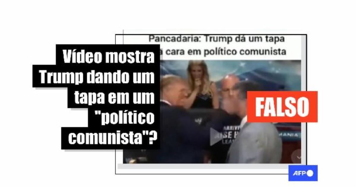 “Pancadaria: Trump dá um tapa na cara em político comunista”, diz uma das publicações que circulam no Kwai, no Instagram no TikTok e no X.