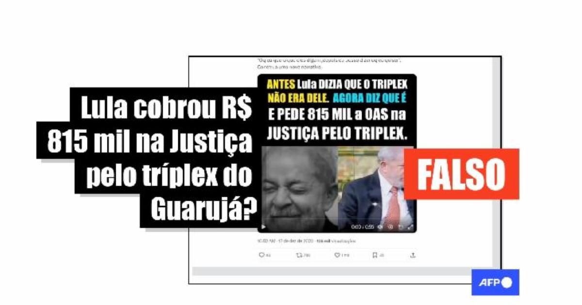“Antes Lula dizia que o tríplex não era dele. Agora diz que é e pede 815 mil a OAS na Justiça pelo tríplex”, lê-se em um vídeo compartilhado no X, no Kwai e no Facebook. A publicação circula ao menos desde fevereiro de 2022.