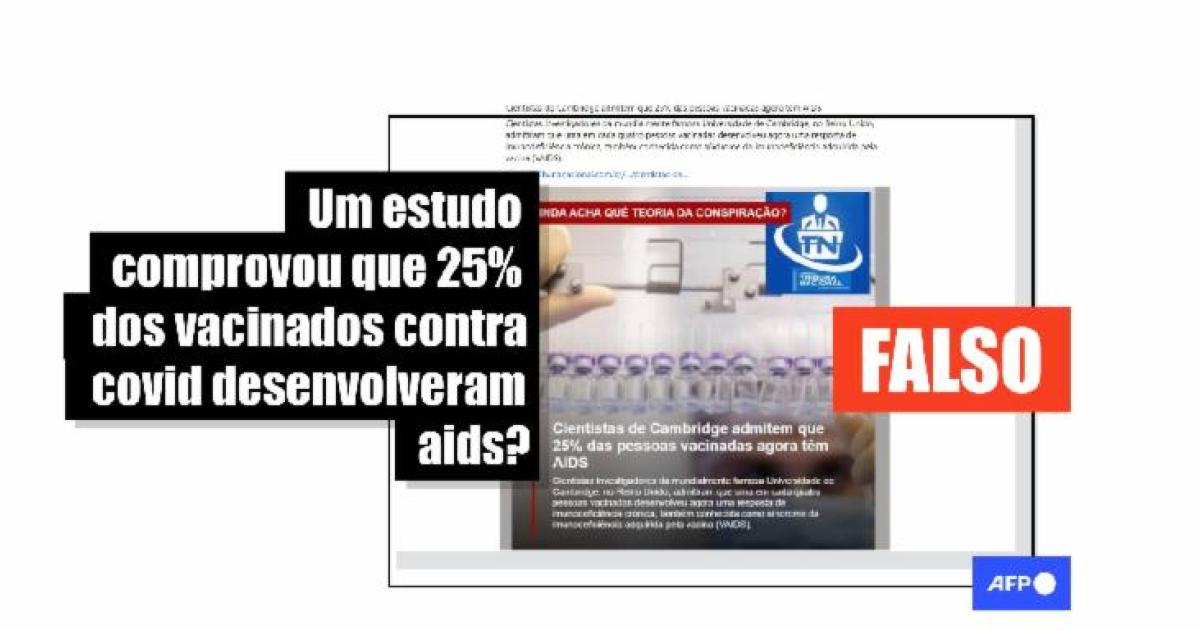 Apesar da sua eficácia comprovada contra formas graves da covid-19, a vacinação é alvo frequente de informações falsas. Desde 11 de dezembro de 2023, publicações com mais de mil visualizações, afirmam que um estudo da Universidade de Cambridge concluiu que “25% das pessoas imunizadas” desenvolveram aids, doença causada pelo vírus da imunodeficiência humana (HIV). Mas, não foi estabelecida nenhuma ligação entre a doença e a vacinação anticovid. O estudo de Cambridge citado é falsamente interpretado, lamentaram os seus autores à AFP.