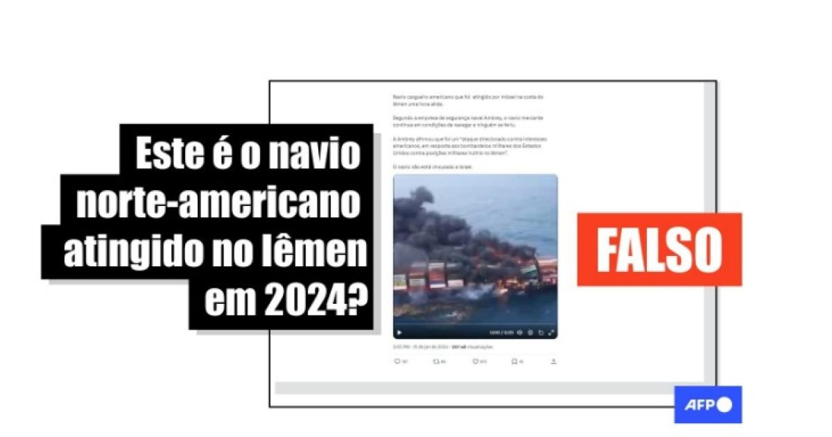 “Navio cargueiro americano que foi atingido por míssel na costa do Iêmen uma hora atrás”, diz uma das mensagens compartilhadas no X. O vídeo também circula no Facebook, no Instagram, no TikTok, no Kwai e no Telegram.