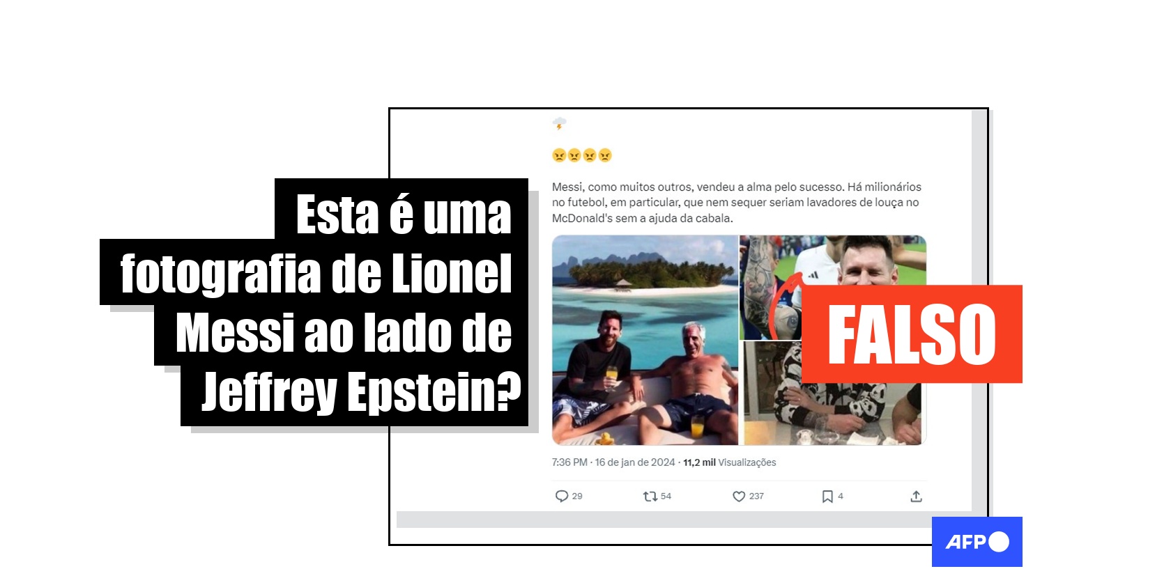 Em 3 de janeiro de 2024, um juiz ordenou a desclassificação de documentos judiciais com nomes de pessoas ligadas a Jeffrey Epstein, falecido magnata norte-americano acusado de tráfico sexual de menores. A partir disso, publicações com mais de 12 mil visualizações nas redes sociais compartilham uma imagem de Epstein com o jogador de futebol argentino Lionel Messi em uma ilha. No entanto, especialistas indicaram à AFP que a cena foi criada com inteligência artificial, que apresenta inconsistências e que não há correspondência temporal na aparência de Messi.