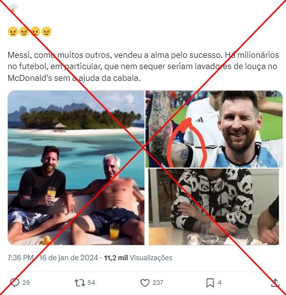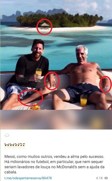 “Messi, como muitos outros, vendeu a alma pelo sucesso. Há milionários no futebol, em particular, que nem sequer seriam lavadores de louça no McDonald's sem a ajuda da cabala”, diz a legenda de uma das publicações que circulam com a imagem, compartilhada no Telegram, no Twitter e no Facebook.