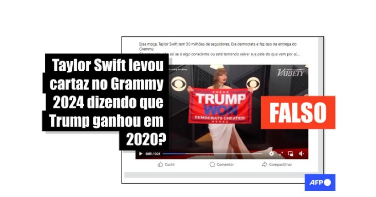 “Essa moça, Taylor Swift tem 50 milhões de seguidores. Era democrata e fez isso na entrega do Grammy. Cá entre nós, não sei se é algo consciente ou está tentando salvar sua pele”, diz a mensagem que circula no Facebook. No X, o mesmo conteúdo foi compartilhado, supostamente como sátira, e posteriormente apagado.