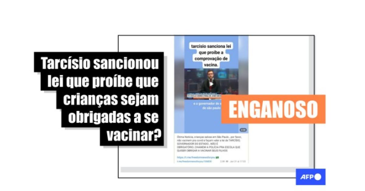 “Ótima Notícia. Crianças salvas em São Paulo...por favor, não vacinem prá covid e façam valer a lei de TARCÍSIO, GOVERNADOR DO ESTADO...NÃO É OBRIGATÓRIO..CHAMEM A POLÍCIA PRÁ ESCOLA QUE QUISER OBRIGAR A VACINAR SEUS FILHOS”, diz a legenda de um vídeo que circula no Telegram, no Facebook e no X.