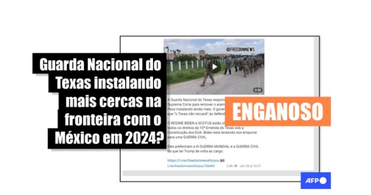 “A Guarda Nacional do Texas responde à ordem da Suprema Corte para remover o arame farpado em Eagle Pass instalando ainda mais. O governador Abbott disse que ‘o Texas não recuará’ ao defender sua fronteira”, diz a legenda de um vídeo compartilhado no Threads, no Facebook, no Telegram, no Twitter e no LinkedIn.