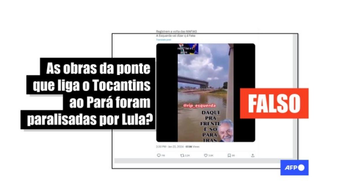 “A ponte que liga o Pará ao Tocantins. 1.700 metros concluídos de ponte. Vou mostrar o que é que ficou faltando para terminar a obra (...). Araguaína - Xambioá. Veja aí: ponte concluída de ponta a ponta, faltou só a cabeceira. E os bandidos, ladrões (...) abandonaram a obra (...). E aí tem quatro balsas desse tamanho aqui com uma imensidão de carros fazendo a travessia direto”, diz um narrador em um vídeo compartilhado no Facebook, no Instagram, no TikTok, no X e no Kwai.
