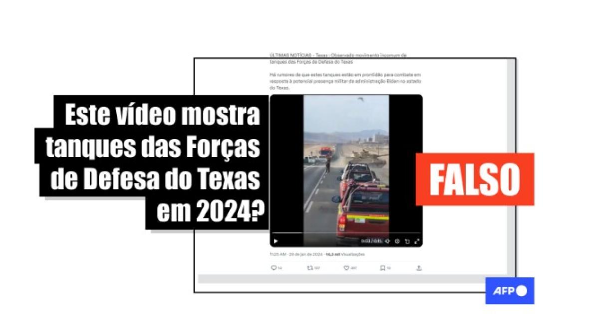 “Observado movimento incomum de tanques das Forças de Defesa do Texas. Há rumores de que estes tanques estão em prontidão para combate em resposta à potencial presença militar da administração Biden no estado do Texas”, diz a legenda de publicações no Facebook, no Telegram, no Kwai e no X.