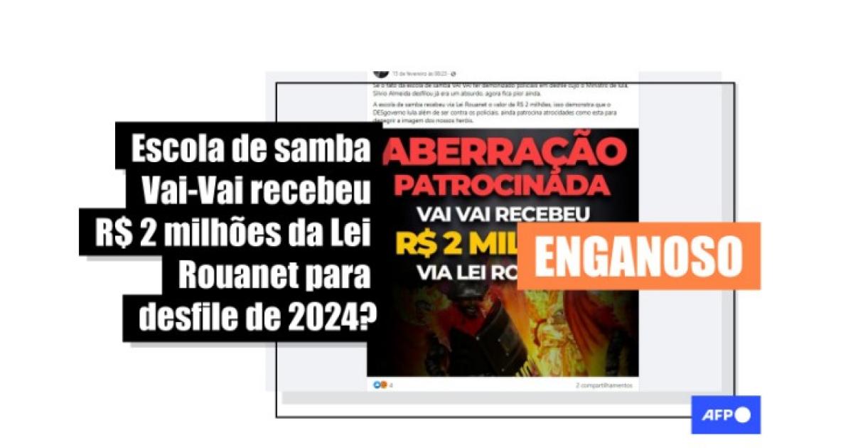“Aberração patrocinada. Vai vai recebeu R$ 2 milhões via Lei Rouanet”, afirma o texto que circula no Facebook e no X.