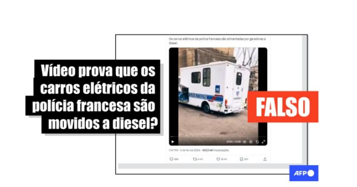 Mas o carro elétrico da polícia francesa que aparece nas imagens não é movido por um gerador a diesel, como afirmam as postagens.