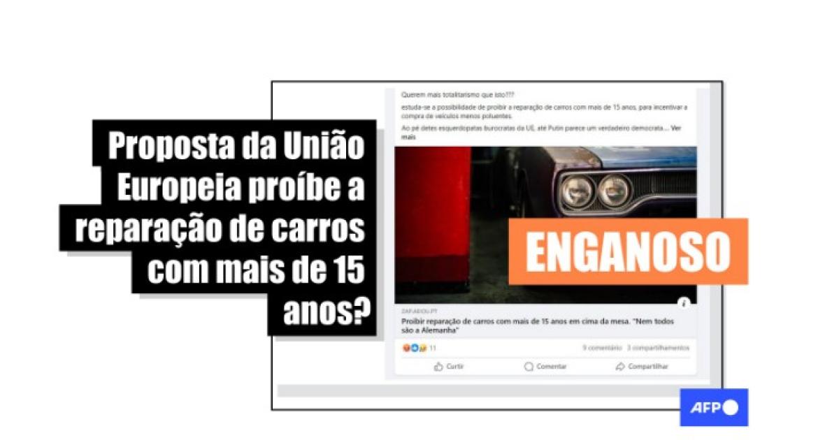 “Então a União Europeia tem uma proposta para proibir a reparação de automóveis com mais de 15 anos estes alucinados acham que as pessoas não abatem os carros por opção…”, diz uma das publicações que circulam no X e no Facebook.